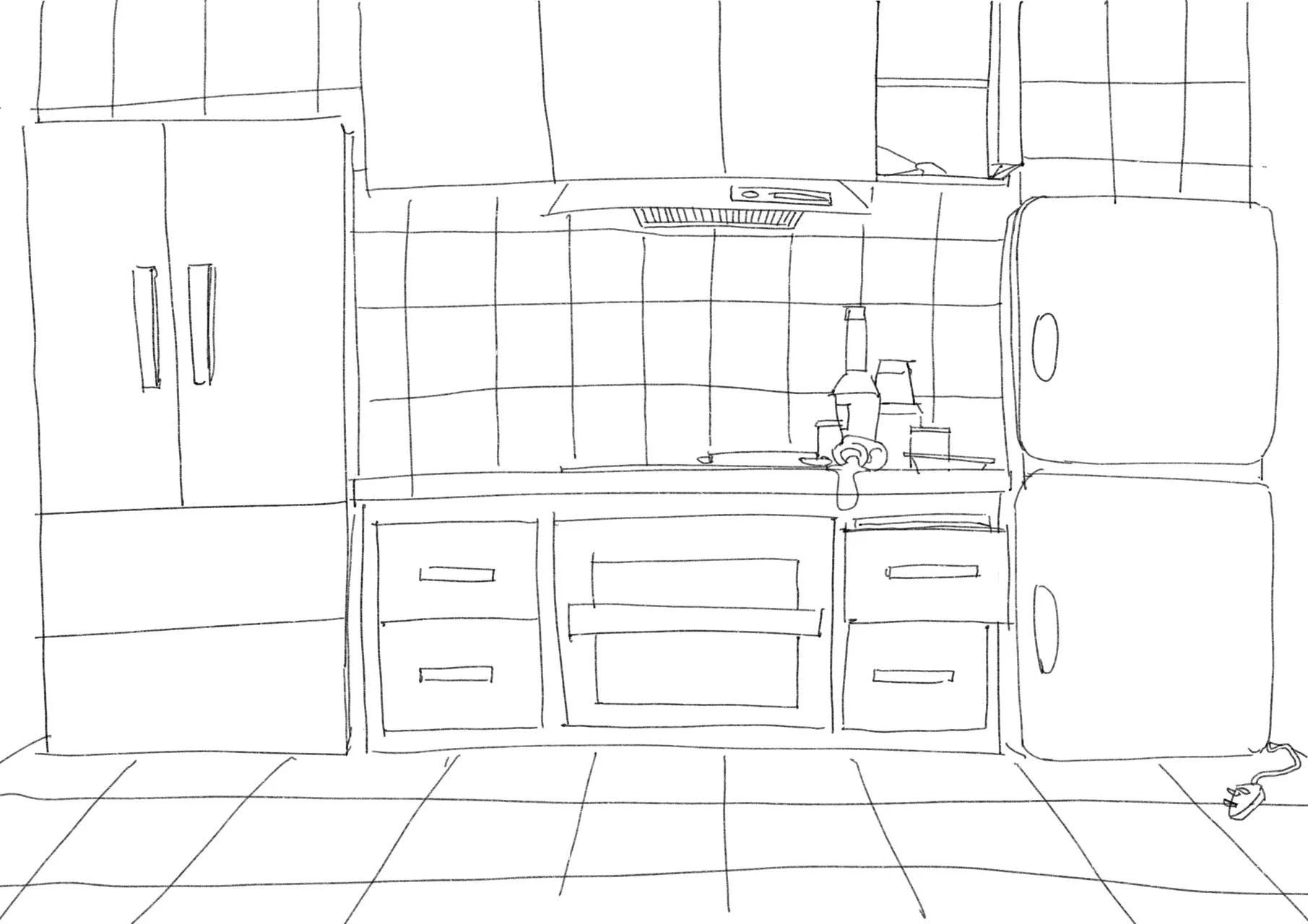 This is the atmosphere concept design for the kitchen, where the entire space is built on perfect bilateral symmetry. The layout visually reinforces the central conflict: the obsessive-compulsive roommate maintains a spotless, meticulously organized side, while the other side belongs to the messy, food-driven character.